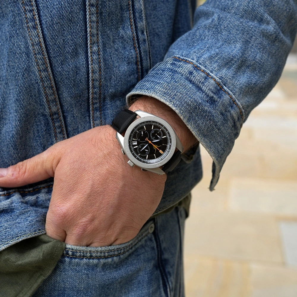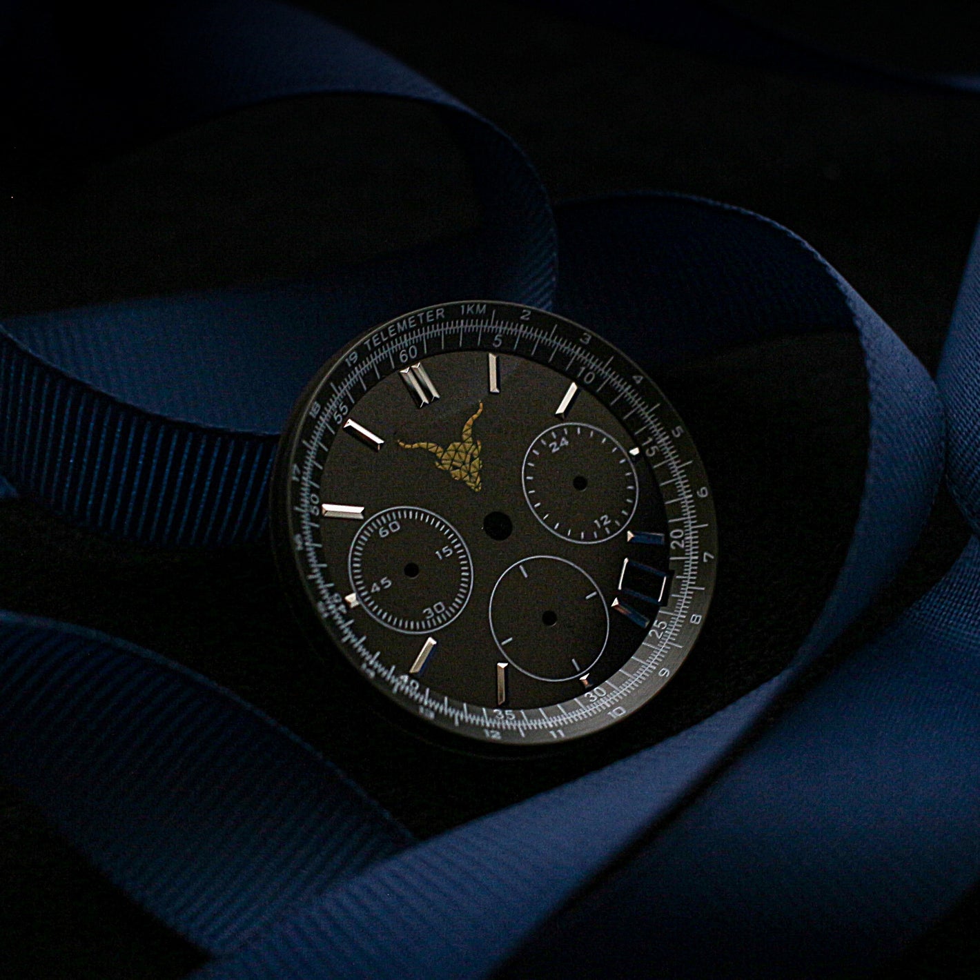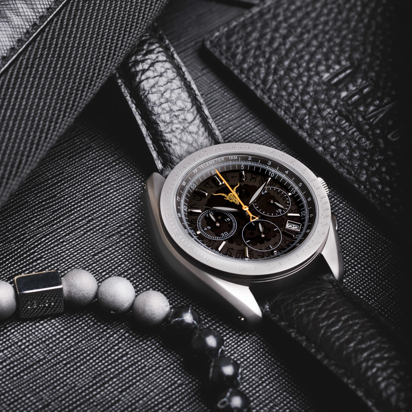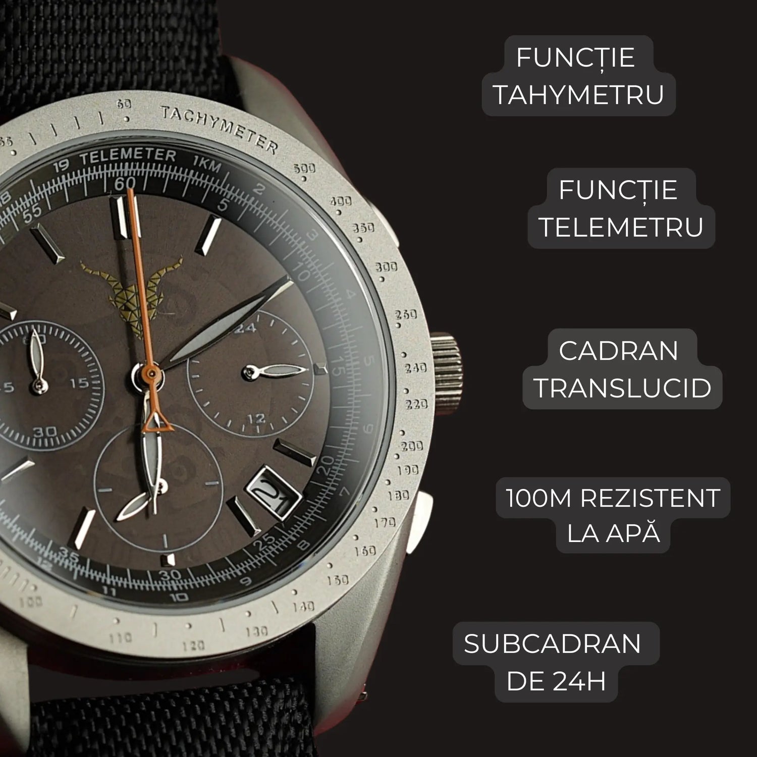 Functii rare – tahimetru gravat, telemetru si sub-cadrane functionale precum 60min, 24h si secundar