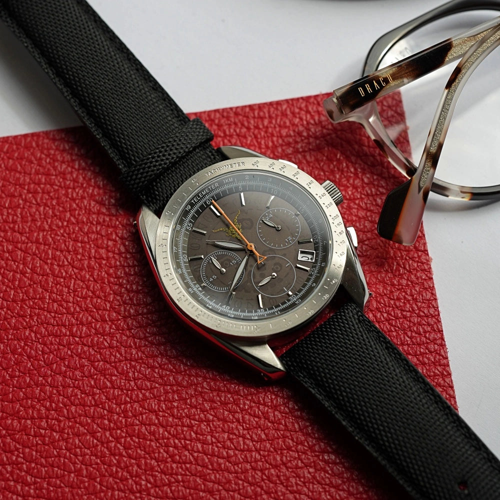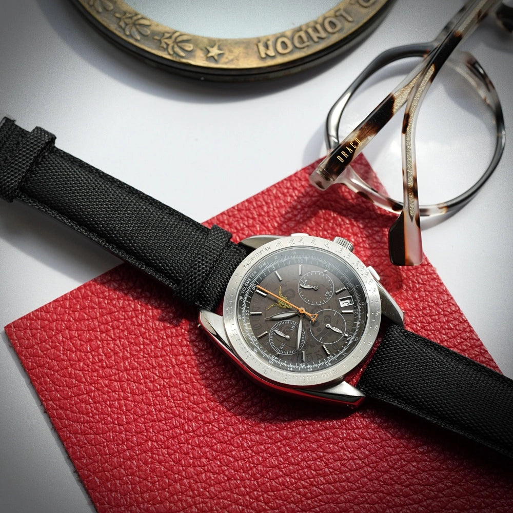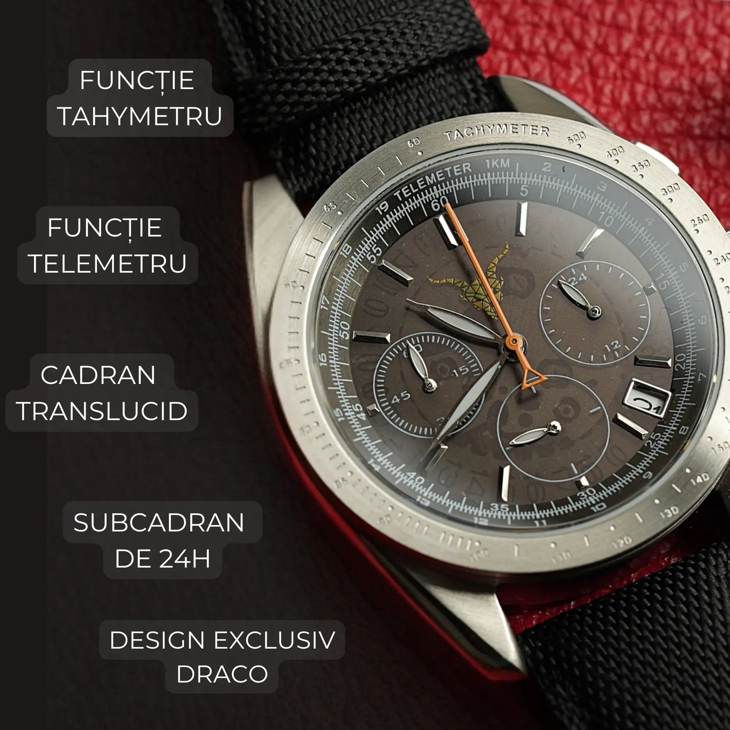 - Functii rare – telemetru real, tahimetru gravat si subcadran 24h, o combinatie extrem de rara pe ceasurile din comert.