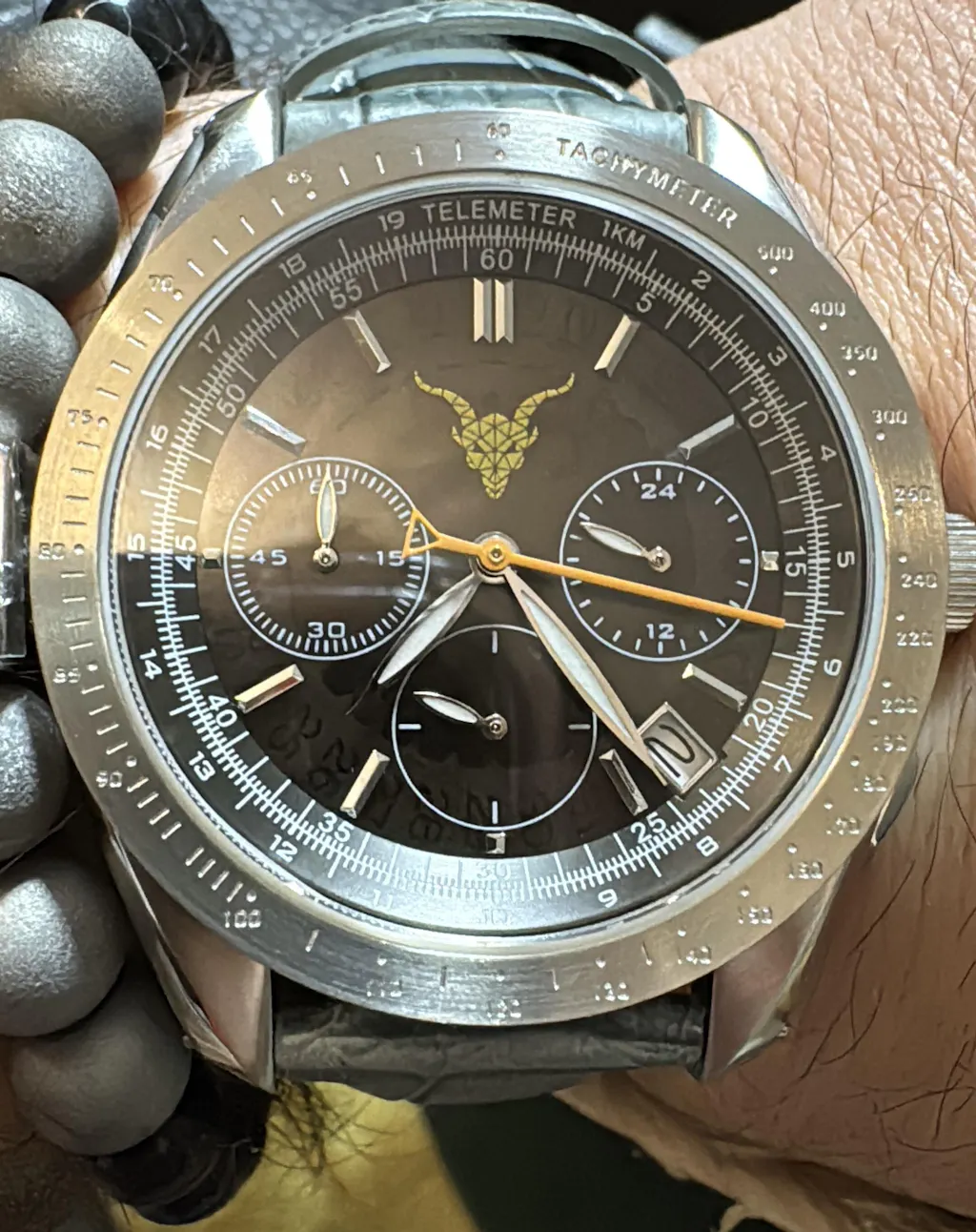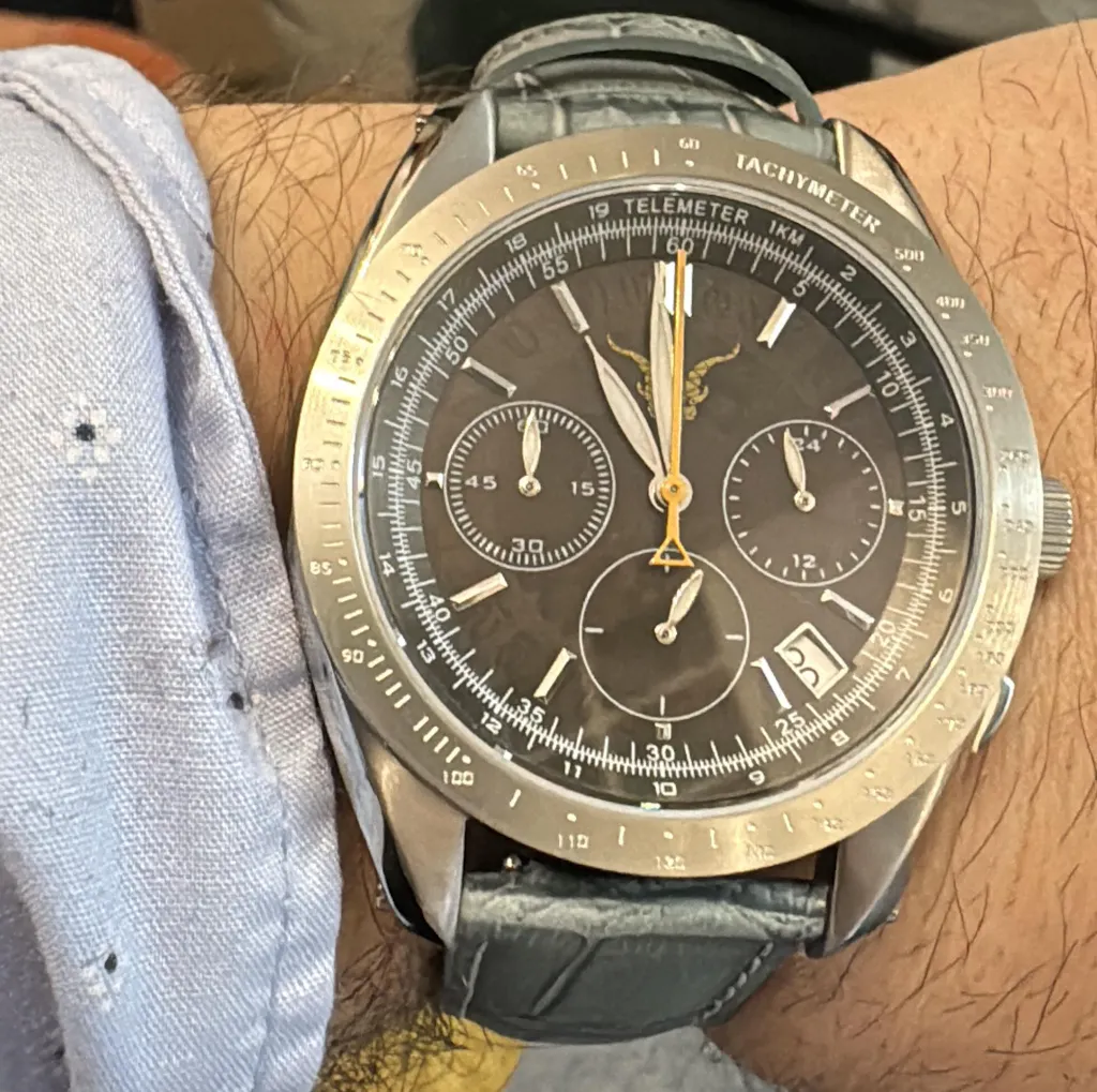 - Functii rare – telemetru real, tahimetru gravat si subcadran 24h, o combinatie extrem de rara pe ceasurile din comert.