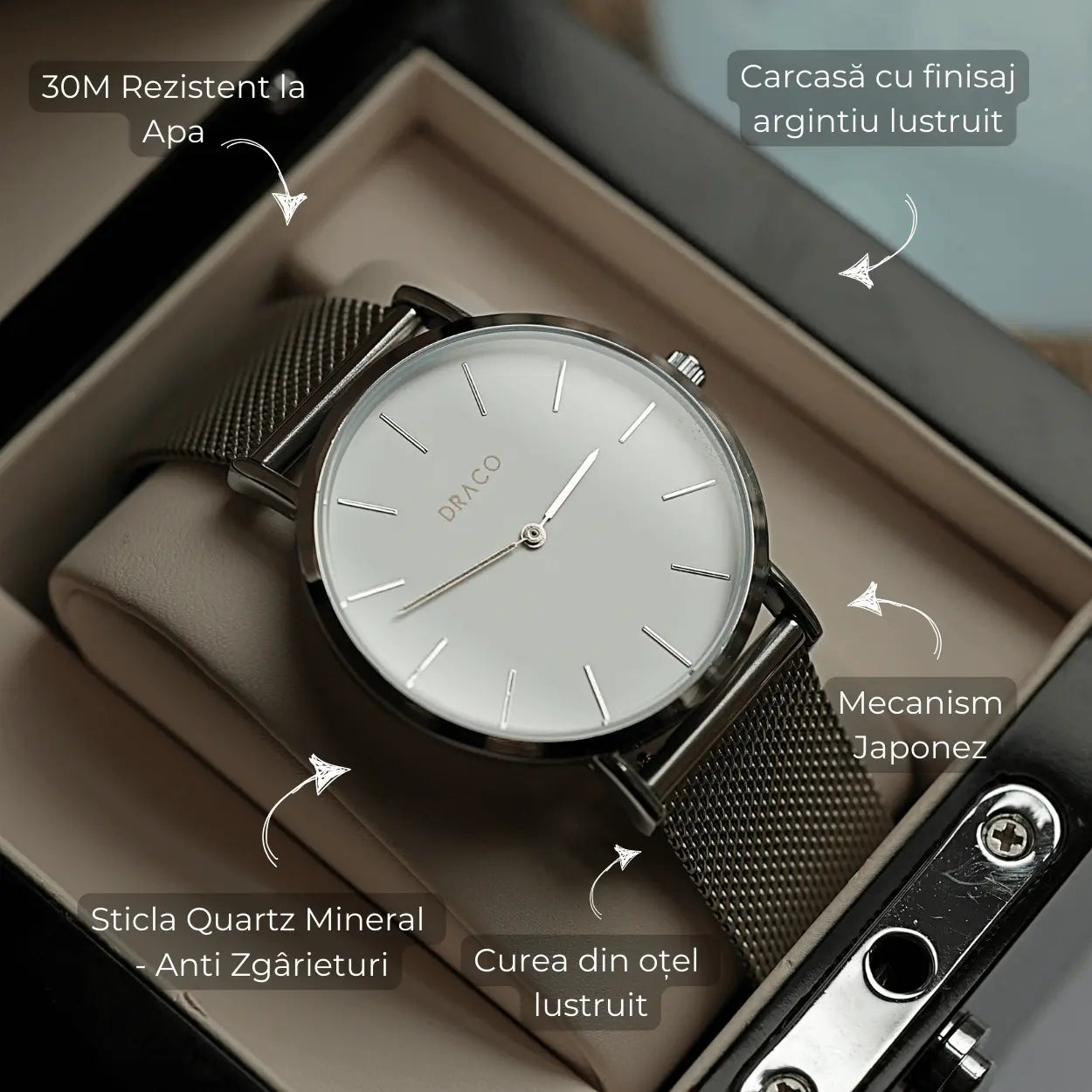 🧠 Design subtire, gandit pentru confort zilnic, cadranul neutru potriveste cu orice tinuta – business sau casual. Ceasul rezista la stropi, ploaie si spalat pe maini.